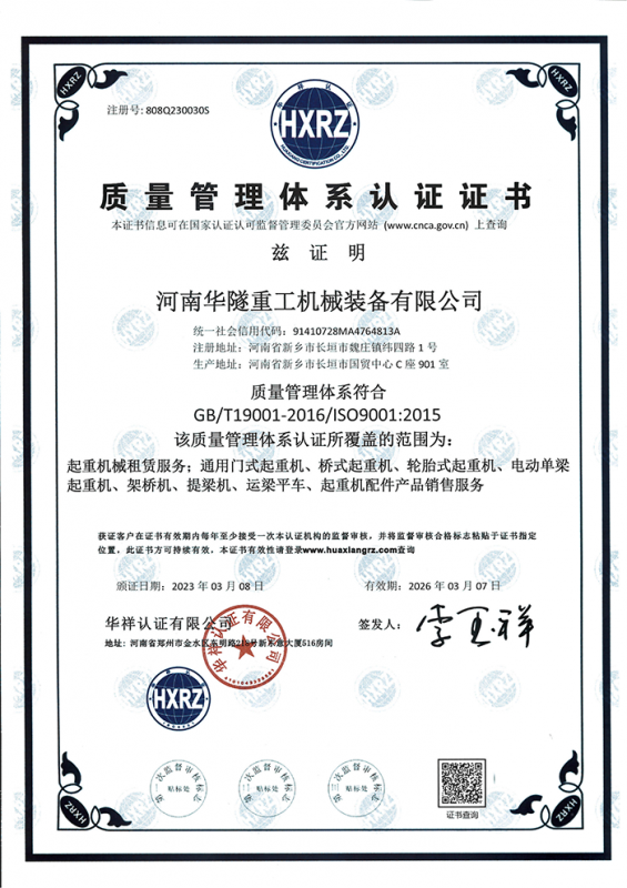 河南華隧重工機械裝備有限公司主要從事通用門式起重機、橋式起重機、電動單梁起重機,輪胎式起重機、架橋機、提梁機、遠梁平車、鋼絲繩電動萌蘆、卷揚機、起重配件制造、銷售:起重機械租賃、安裝和維修,起重設備園收,機械設備維修,鋼結構工程承包,橋梁工程及技術咨淘服務,銷售五金制品、機電設備:建設工程監理,建設工程設計,各類工程建設活動,建筑勞務分包,建筑物折除作業,施工作業,工程管理服務,土石方工程施工,裝如發運?! 」疽淹ㄟ^IS0國際質量、環境、健康與安全三合一標準認證,特種設備制造許可證和特種設備安裝改造維修許可證。擁有完熟的質量管理體系。嚴格的管理制度,強大的生產能力和先進的檢測手段,在保證產品質量的同時,也具備了極強的市場競爭力?! 」緢猿挚萍紕撔聻槔砟?,產品質量為核心,注重信譽,建立了減信可靠、快捷、思速。便利周到的售后服務網絡?! ∥覀儞碛械募夹g專家和技術服務隊伍為客戶提供充善的售前技術支持和全天候的售后服務體系,讓您無后顧之憂,享受一站式的超值服務?!  叭A隧重工,伴您成功“是華隧重工永遠的宗指,真被的希望與各界朋友攜手并進。共創輝準!